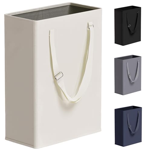 Smal tvättkorg med justerbara långa handtag, 45 L små tvättkorgar med nättopp, smal smutsig klädkorg för sovrum, garderob och badrum – beige