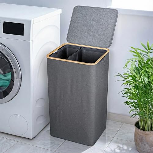 LONBET 100 L tvättkorg med lock och robust bamburam – estetisk tvättkorg med sidohandtag och tillverkad av andningsbart tyg – tvättkorg med avtagbar väska, klädkorg grå