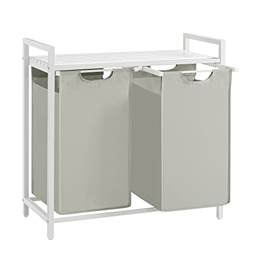 VASAGLE tvättkorg 2 fack, tvättuppsamlare med hylla, tvättlåda, tvättpåse av Oxfordtyg, utdragbar, avtagbar, metallram, 2 x 46 L, 73 x 33 x 72 cm, vit BLH201W01
