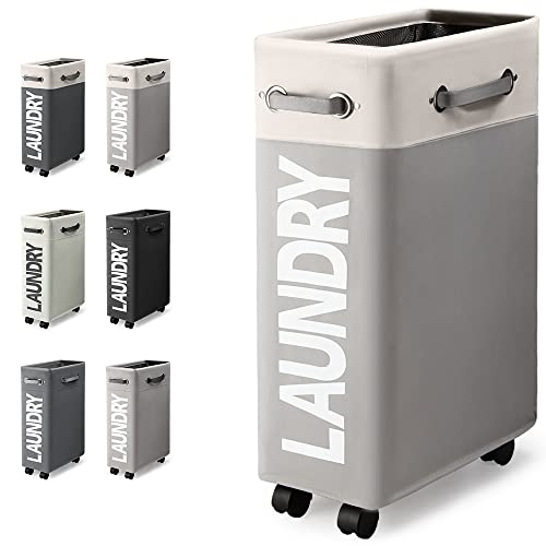Rieeyrslza Fällbar Tvättkorg med Rullar 45L Smal Oxfordväv Fällbar Tvättkorg Tunn Tvättuppsamlare Fällbara Tvättkorgar med Hjul Tvättlåda Tvättpåsar Tvättuppsamlare(Vit + Ljusgrå o2)
