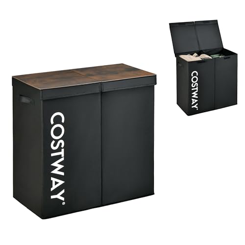COSTWAY 115 l tvättkorg med lock, tvättkorg, 2 fack, tvättlåda av fleece-tyg med handtag, 62 x 31 x 60 cm (svart)