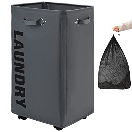 DOKEHOM 29-Tums Extra stor tvättkorg med avtagbart tvättpåse och hjul, Hopfällbar rullande tvättkorg, Vikbar klädorganisator, Hopfällbar tvättlåda (Mörkgrå)