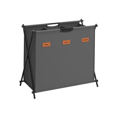 SONGMICS tvättkorg, 135 liters tvättkorg, tvättlåda, 3 fack, hopfällbar X-ram, individuella etiketter, för tvättstuga, sovrum, badrum, skiffergrå LCB130G01