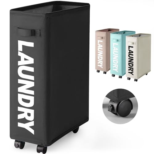 Rieeyrslza Fällbar Tvättkorg med Rullar 45L Smal Oxfordväv Fällbar Tvättkorg Tunn Tvättuppsamlare Fällbara Tvättkorgar med Hjul Tvättlåda Tvättpåsar Tvättuppsamlare(Svart o2)