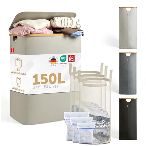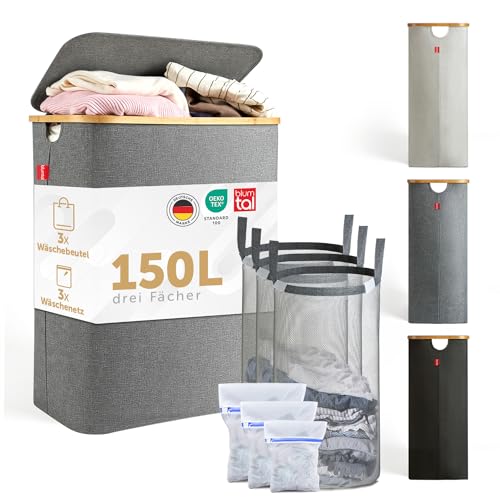 Blumtal tvättkorg 3 fack 150L med 3 löstagbara tvättsäckar, tvättkorg grå, tvättkorg 3 fack, tvättkorg, tvättkorg med lock, tvättlåda