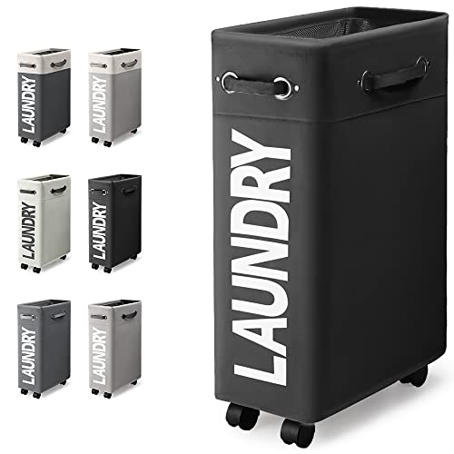 Rieeyrslza Fällbar Tvättkorg med Rullar 43L Smal Oxfordväv Fällbar Tvättkorg Tunn Tvättuppsamlare Fällbara Tvättkorgar med Hjul Tvättlåda Tvättpåsar Tvättuppsamlare (Svart)