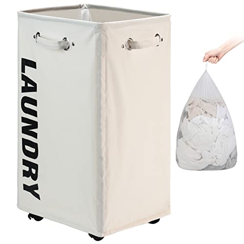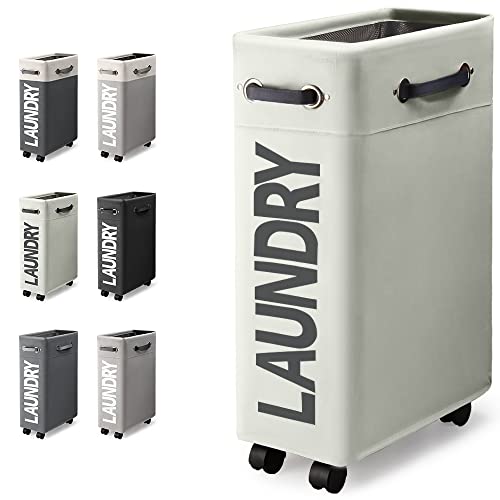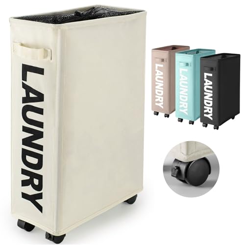 Rieeyrslza Fällbar Tvättkorg med Rullar 45L Smal Oxfordväv Fällbar Tvättkorg Tunn Tvättuppsamlare Fällbara Tvättkorgar med Hjul Tvättlåda Tvättpåsar Tvättuppsamlare(Beige o2)