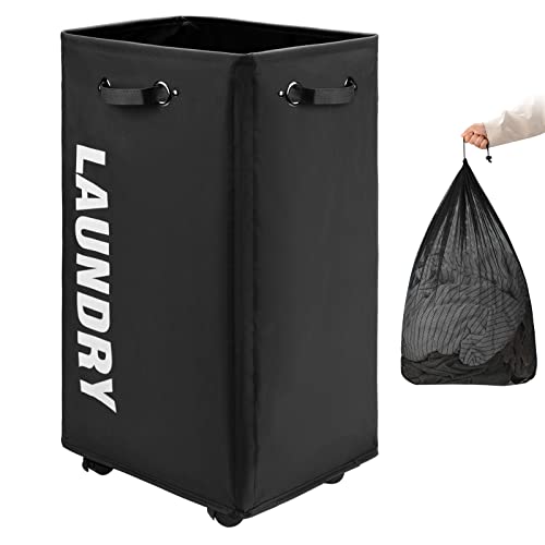 DOKEHOM 29-Tums Extra stor tvättkorg med avtagbart tvättpåse och hjul, Hopfällbar rullande tvättkorg, Vikbar klädorganisator, Hopfällbar tvättlåda (Svart)
