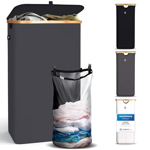 HENNEZ Stor vikbar tvättkorg i grå färg med lock - Hållbar och högkvalitativ tvättlåda med 2 Fack för sortering av tvätt - Avtagbara innerpåsar - Praktiska handtag för enkel transportering - Robust