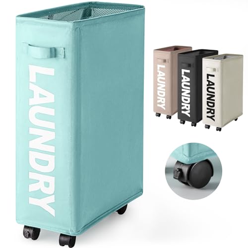 Rieeyrslza Fällbar Tvättkorg med Rullar 43L Smal Oxfordväv Fällbar Tvättkorg Tunn Tvättuppsamlare Fällbara Tvättkorgar med Hjul Tvättlåda Tvättpåsar Tvättuppsamlare(Ljusblå)