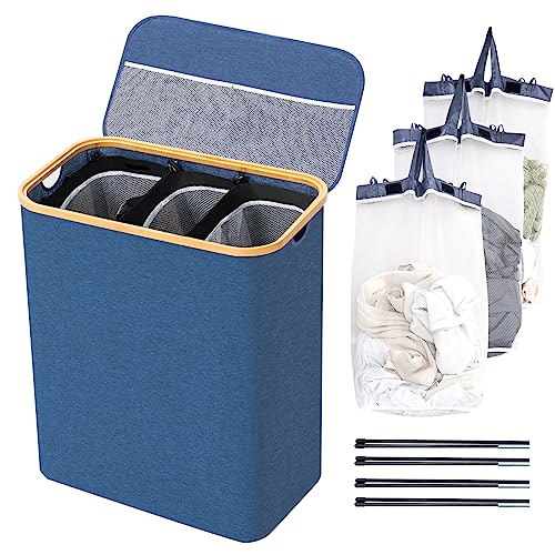 BRIAN & DANY Tvättkorg, 3 fack med lock, tvättkorg, tvättsorteringssystem, avtagbar vattenavvisande vikbar tvättlåda, smal tvättkorg, 145 l för familjen XXL, blå