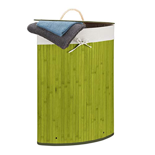 Relaxdays Hörntvättkorg bambu, vikbar tvättlåda 60 l, utrymmesbesparande, tvättpåse bomull, HBT 65 x 49,5 x 37 cm, grön