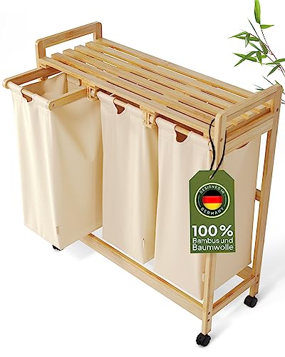 AMBIAVO® Tvättkorg 3 Fack Med Hjul [Beige, 100% Bomull, Bambu, 90 L Volym] | Tvättsorteringssystem | Trätvättsorterare | Tvättlåda
