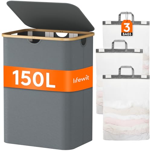 Lifewit 150 l tvättkorg med lock, tvättkorg, 3 fack, stor tvättlåda, tvättsorterare, tvättkorg, tvättkorg, tvättkorg, tvättkorg, tvättkorg för tvättkammare, badrum, sovrum, grå