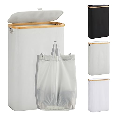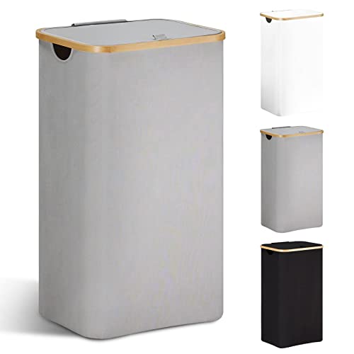 YOUDENOVA Tvättkorg med lock, 85 liter, smal, med tvättsäck, stor hopfällbar tvättsorterare av trä och bambu, hög, Grå