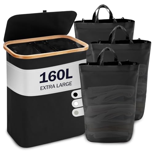 YOUDENOVA Tvättkorg med lock, 3 fack, 160 liter, med 3 tvättsäckar, stor hopfällbar hög tvättsorterare av trä och bambu, hög, Svart