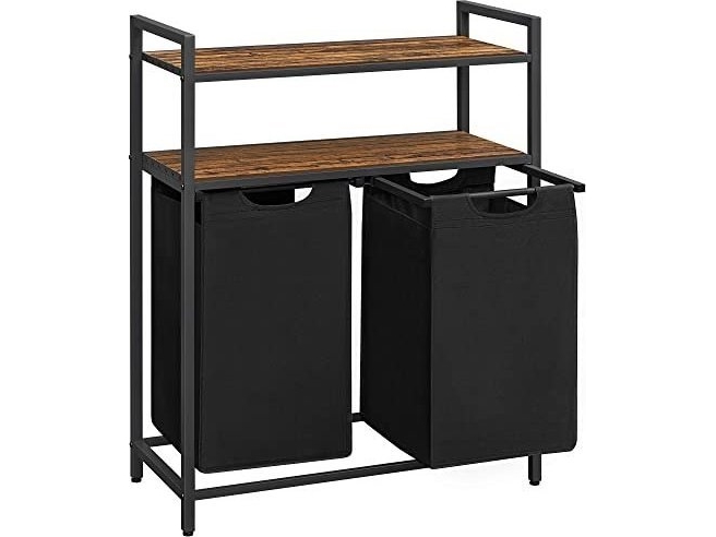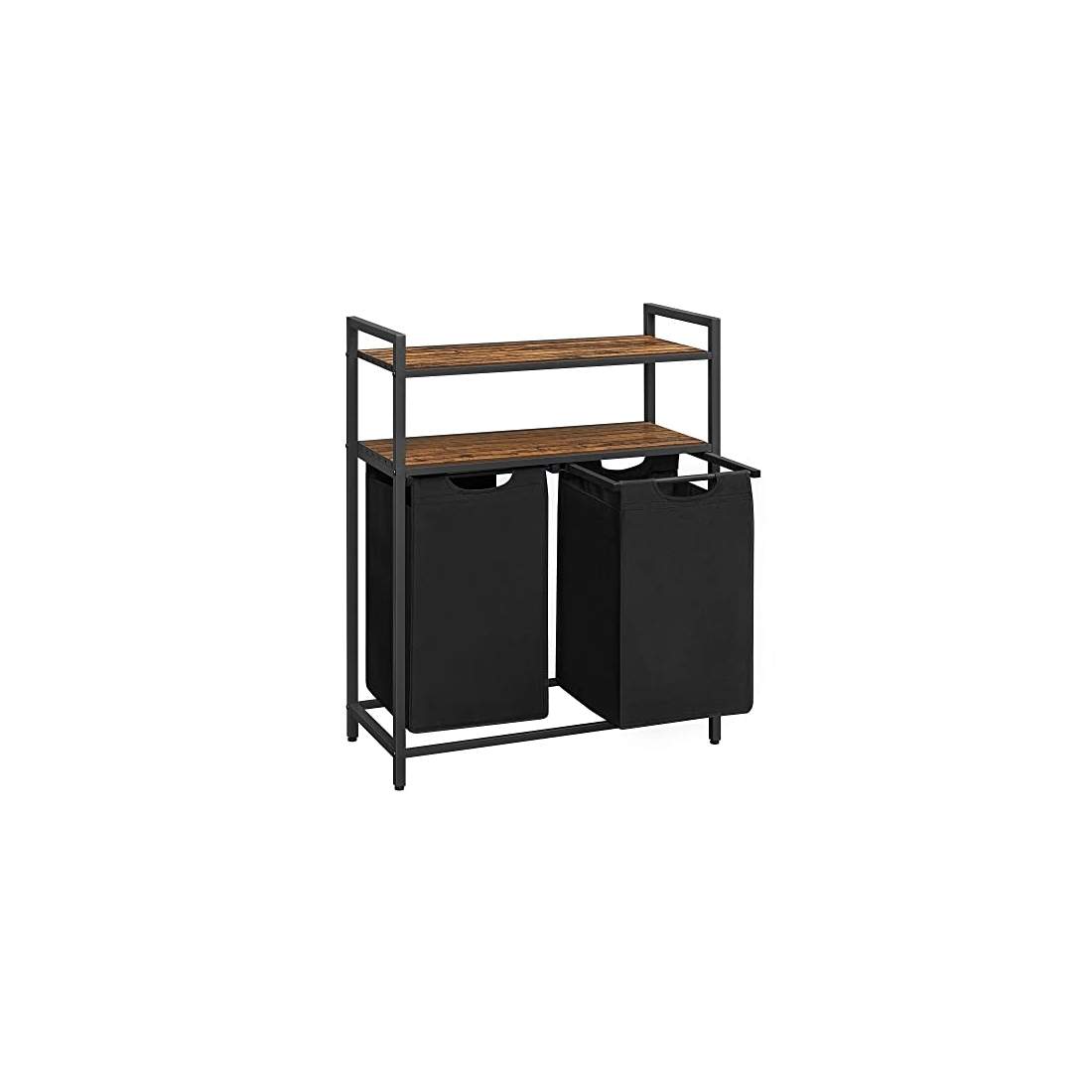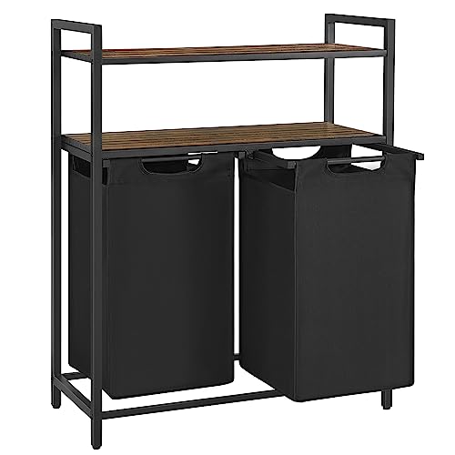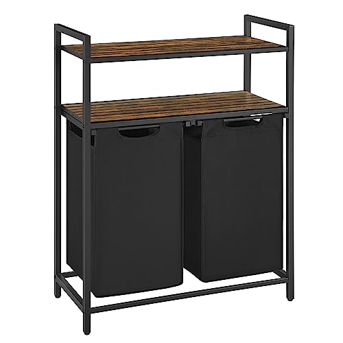 VASAGLE Tvättkorg, tvättkorg, tvättsorterare med 2 utdragbara och avtagbara väskor, 2 hyllor, 12,2 gallon kapacitet per väska, för badrum, tvättstuga, rustik brun och svart UBLH211B01