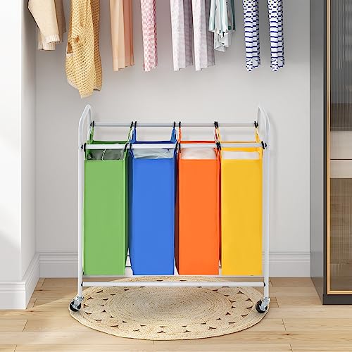 ROMOON Tvättsorterare, 4-sektioners tvättkorg med hjul, rullande tvättkorg med stor kapacitet och avtagbara väskor för förvaring av kläder, flerfärgad