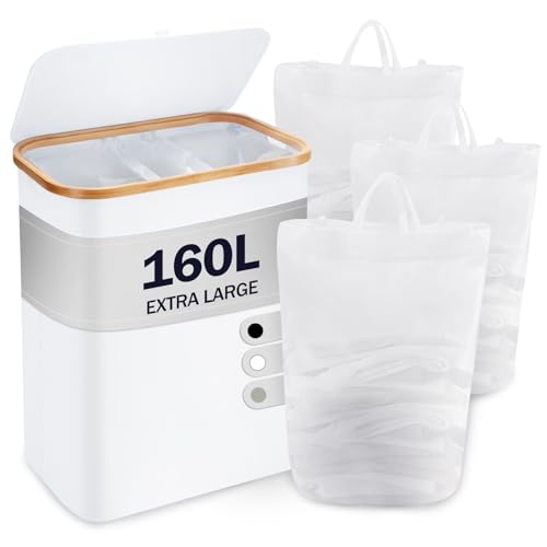 YOUDENOVA Tvättkorg med lock, 3 fack, 160 liter, med 3 tvättsäckar, stor hopfällbar hög tvättsorterare av trä och bambu, hög, vit