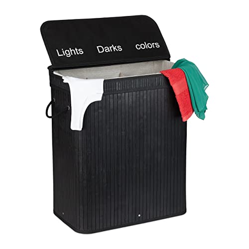 Relaxdays Bambu tvättkorg, rektangulär tvättsorterare, 2 fack, fällbart lock, platsbesparande vikbar, 95 l, svart, 63 x 55 x 35 cm