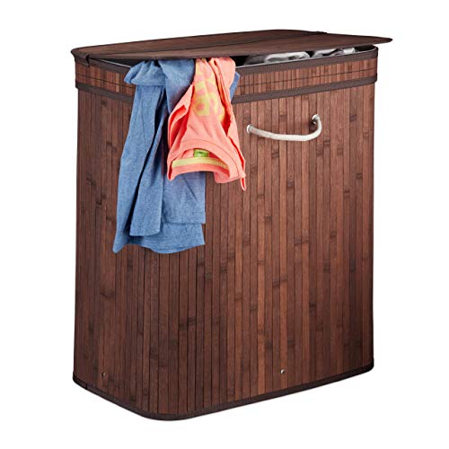 Relaxdays Bambu tvättkorg, rektangulär tvättsorterare, 2 fack, med gångjärnslock, platsbesparande vikbar, 95 l, brun, 63 x 55 x 35 cm