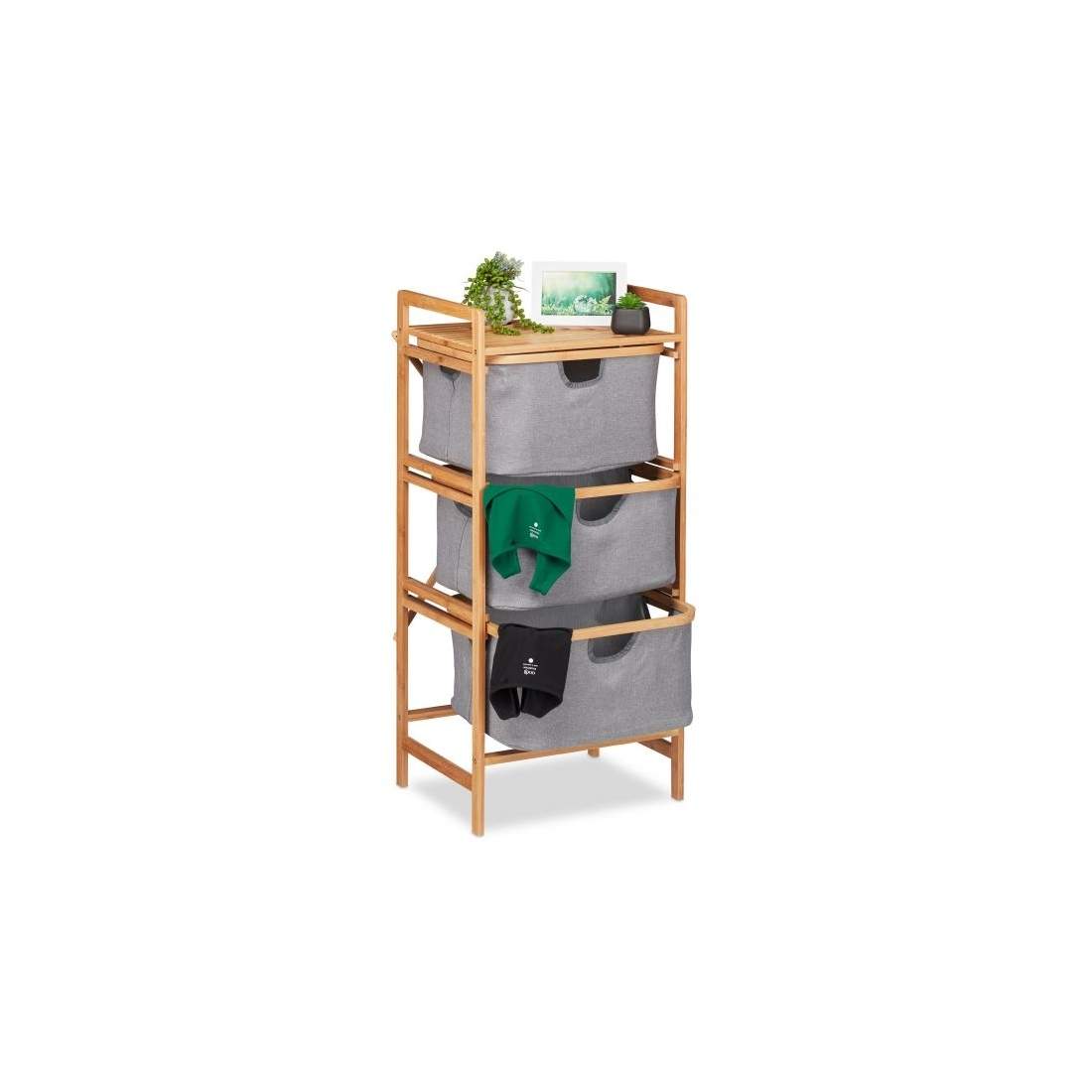 Relaxdays Badrumshylla med tvättkorg, 2 hyllor och 2 tygkorgar, tvättsorterare bambu, HBT: 96 x 44 x 34 cm, natur/grå
