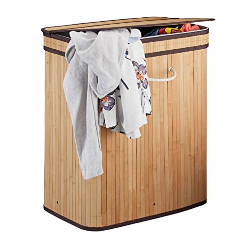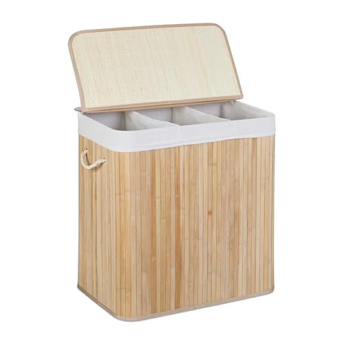 Relaxdays Bambu tvättkorg, rektangulär tvättsorterare, 2 fack, med gångjärnslock, platsbesparande vikbar, 95 l, natur, 63 x 55 x 35 cm