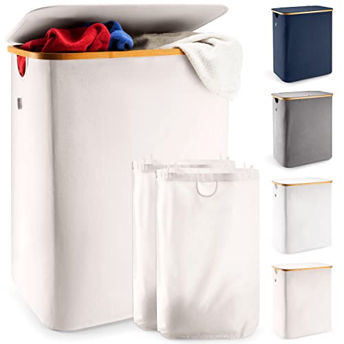 Lonbet – beige dubbel tvättkorg med lock och avtagbara tvättpåsar – XXL 150 L – extra stor korg 2 sektioner – tvättsorterare med 2 fack – bambu dubbel tvättkorg med lock