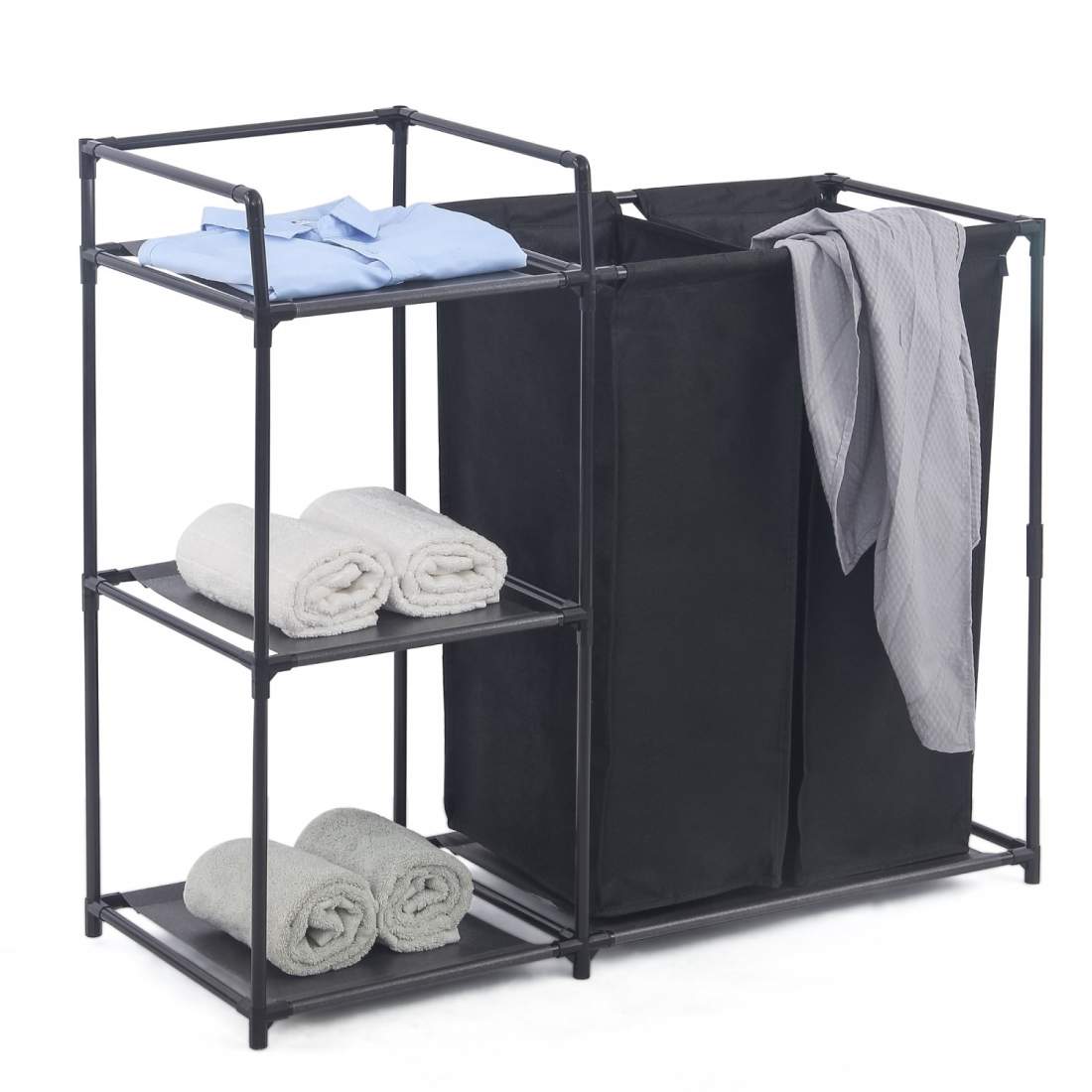 Herzberg HG-04531: 2 löstagbara påsar tvättsorterare med 3-vånings förvaringshylla