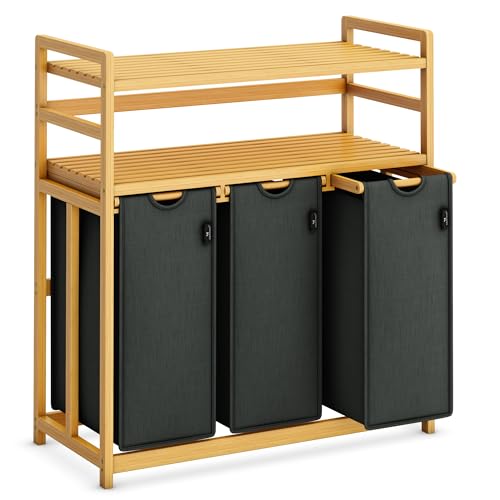 AdelDream tvättkorg 150L 3 fack 2 hyllor utdragbar och avtagbar tvättpåse bamburam tvättlåda tvättkorg tvättsorterare bambu