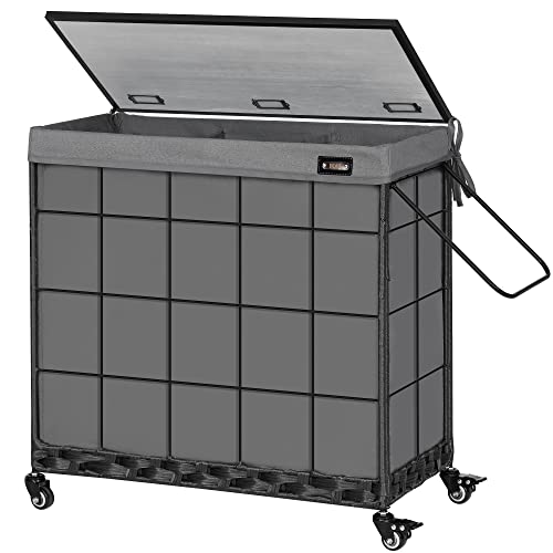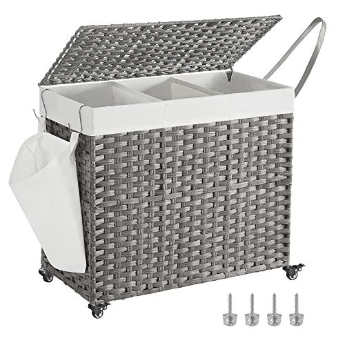 Songmics tvättkorg med lock, 160 l, tvättkorg, 3 fack, tvättsorterare med hjul, i rottinglook, avtagbar, tvättpåse, för tvättstuga, 70 x 36 x 66 cm, grå LCB365G01