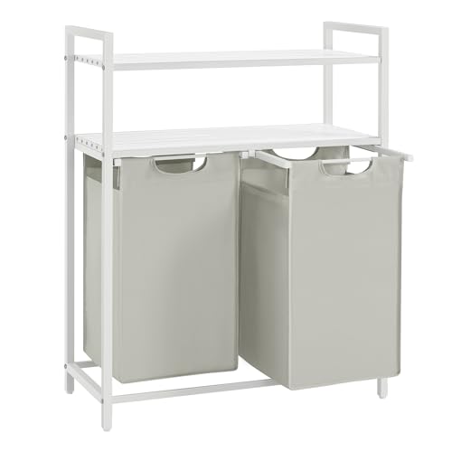 VASAGLE Tvättkorg, tvättkorg, tvättsorterare med 2 utdragbara och avtagbara väskor, 2 hyllor, 46 L kapacitet per påse, för tvättstuga, vit BLH211W01, Vitt, 73 x 33 x 92 cm