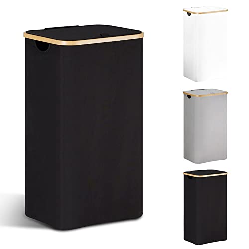 YOUDENOVA Tvättkorg med lock, 48 liter, smal, med tvättsäck, stor hopfällbar tvättsorterare av trä och bambu, hög, Svart