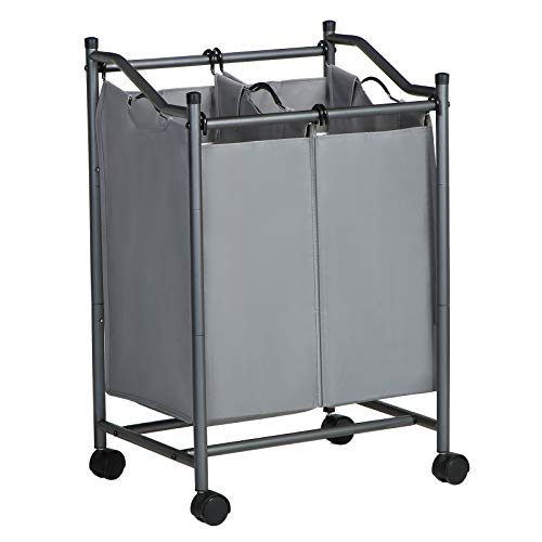 SONGMICS Tvättsorterare med hjul och 2 fack, tvättkorg, tvättkorg med avtagbara fickor, total kapacitet 90 L, grå, LSF002GS