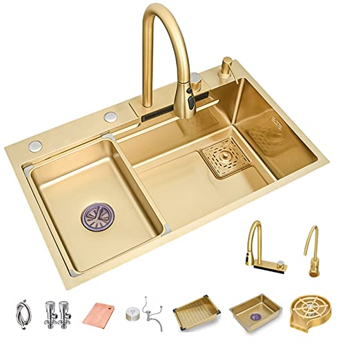 Guld Vattenfall Kök Tvättställ Rostfritt Stål Single Bowl Med Kran Combo Topmount Workstation Med Tillbehör (Color: Gold, Size: 80x45cm)