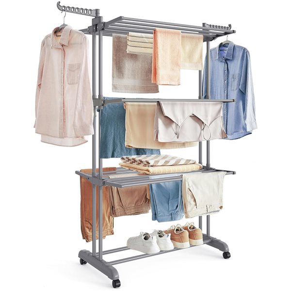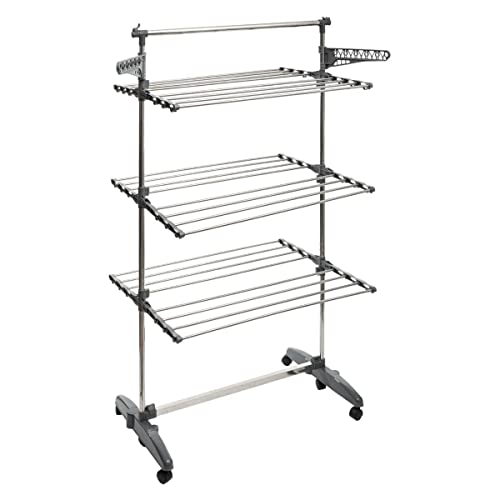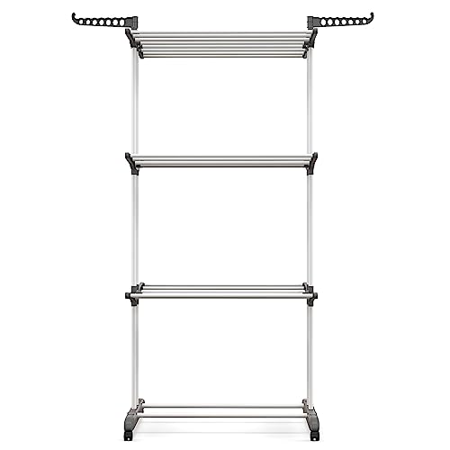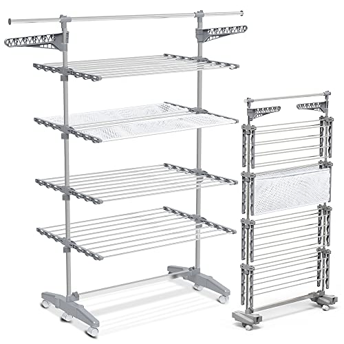 VOUNOT® 4 nivåer, hopfällbar tvättställning med hjul och nät med stor kapacitet, robust torkställ i rostfritt stål, hopfällbara vingar 28 m torkning för användning inomhus/utomhus