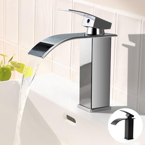 Tvättställsblandare, Badrumskran Vattenfall Vattenkran Badrum Klassisk Vattenfall Badrumsblandare Vattenfallskran för Badrum med Keramikpatron Engreppsblandare Varmt Och Kallt Vatten (Krom)