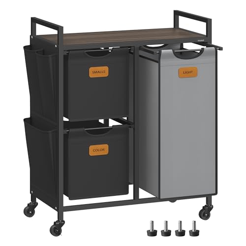 VASAGLE tvättkorg 3 fack, tvättsamlare 100 L, tvättsorterare, hjul, tvättvagn med hylla, tvättpåse, små sidofickor, 6 etiketter, rödbrun-svart-kråkfågelsgrå BLH202B01