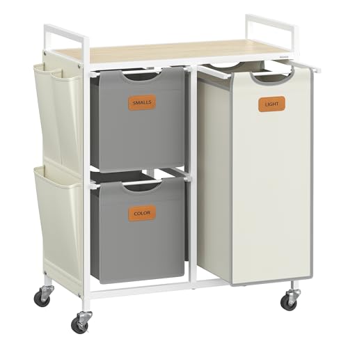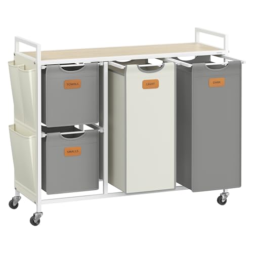 VASAGLE tvättkorg 3 fack, tvättsamlare 100 L, tvättsorterare, hjul, tvättvagn med hylla, tvättpåse, små sidofickor, 6 etiketter, naturbeige-dove grey-cream white BLH202G01