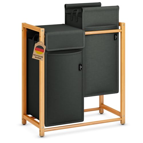 AdelDream Tvättkorg klädsorterare 2 fack tvättvagn med avtagbara fickor, klädsamlare bambu 100 l mörkgrå