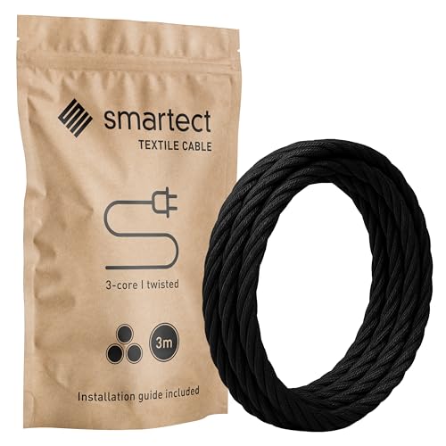smartect Tvinnad Textilkabel för Lampor Svart, 3 Meter Tvinnad trasa täckt Tråd, 3 Prong (3 x 0.75mm²) Trasa Elektrisk Sladd för DIY Projekt