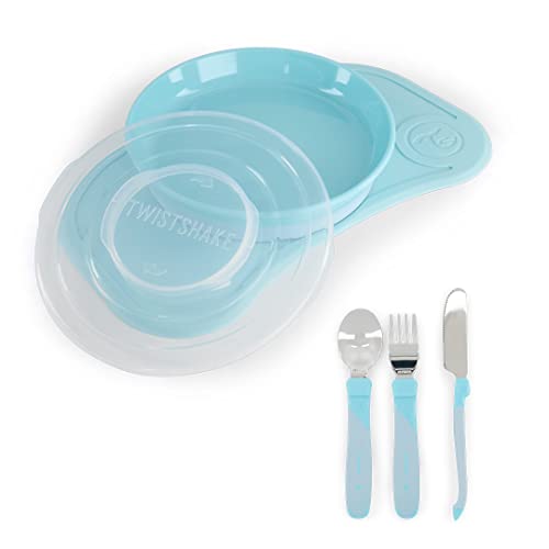 Twistshake Babyservis Set - 4 Delar | 1x Baby Bordstablett - 1 Baby Tallrik - 1 Baby Skål - 3 Bestick i Rostfritt Stål - 1 Drickskopp | 6 Månader+ Babymiddagsset | Porslin för Avvänjning | Ljusblå