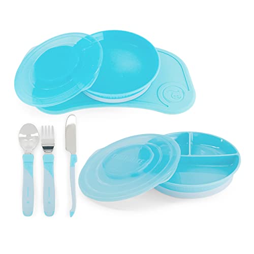 Twistshake Babyservis set - 6 Delar | 1x Baby Silikon Bordstablett - 1x Kid Tallrik - 1x Delad Tallrik - 3x Rostfritt Stål Lär dig Bestick | Babymiddagsset | Porslin för Avvänjning | 6m+ | Blå