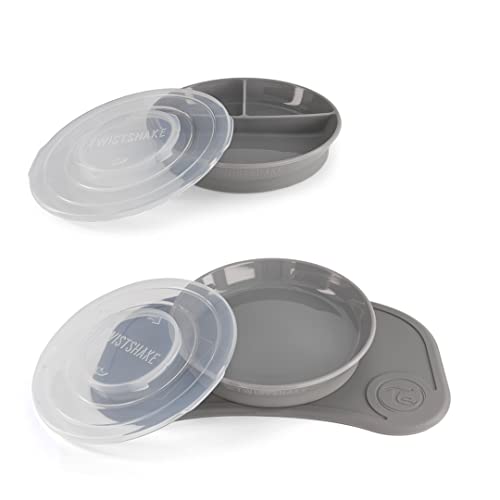 Twistshake Barnservis Set Mini + 3-Delad Tallrik | Click-Mat Mini (31x17cm) + Barntallrik + 3-Delad Tallrik | BPA-fri Tallrik och Bordsunderlägg | 3-delad Träningstallrik | 6+ Månader | Grå