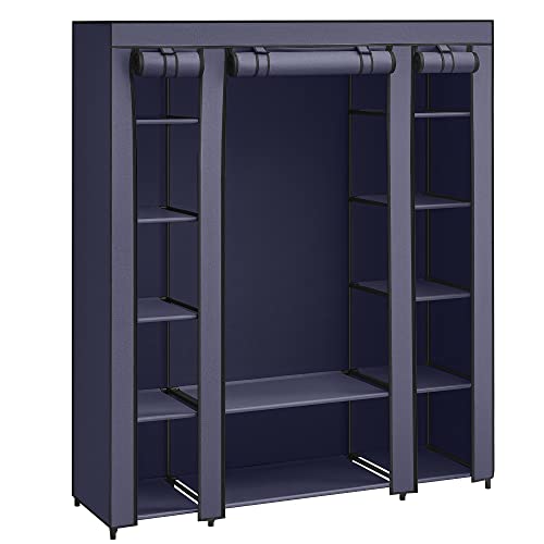 SONGMICS Garderob tygskåp, med överdrag av fleece-tyg, hopfällbart skåp med klädstång, 45 x 150 x 175 cm, 12 hyllor, metallram, skåp för sovrum, marinblått LSF003I02
