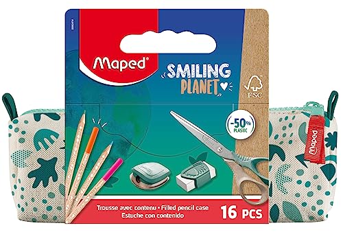 Maped - Smiling Planet pennfodral med skolmaterial - skolväska i tyg + 12 FSC-färgpennor + 1 sax 16 cm + 1 pennvässare med reserv + 1 vitt suddgummi
