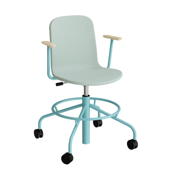 Krysstol ADD 5903 på hjul med armstöd, vitpigmenterad eklaminat, klädd sits med turkos tyg, turkos stativ