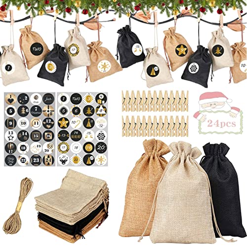 24 jutesäckar, adventskalender för fyllning, adventskalender för män och kvinnor, barn, juladventskalender, tygpåse med dragsko med 24 träklämmor, 10 m hamparep och 48 klistermärken