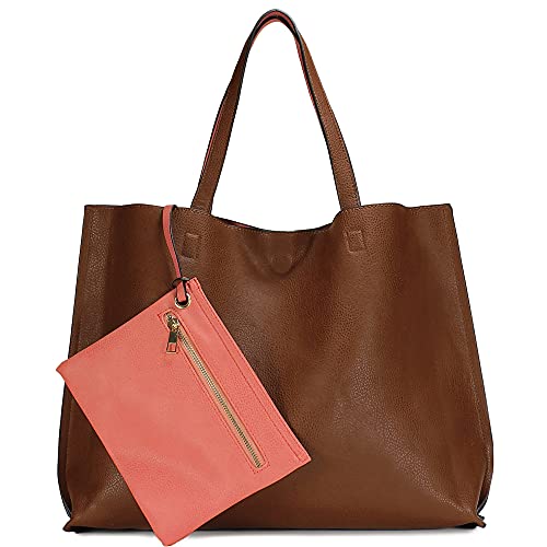 Scarleton Elegant vändbar tygväska för kvinnor, vegansk läderaxelväska, hobo väska, axelväska, H1842, Brun/korallrosa, 15.5 "x 13" x 5.5 ", handväska