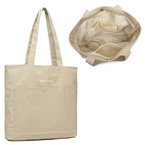 Miss Lulu Dam tygväska kanvasväskor, vattentät och slitstark tygväska, stor kapacitet skolaxelväska, hållbara miljövänliga väskor för shopping, skolor, resor, Khaki, L, Minimal